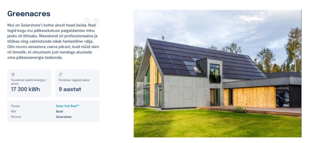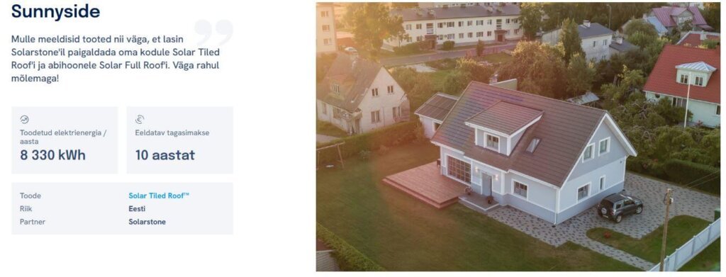 Näide reaalsest Solarstone päikesekatusest Eestis. Allolev projekt näitab, milline võib välja näha integreeritud päikeseenergia katus ning milline on selle tootlikkus.